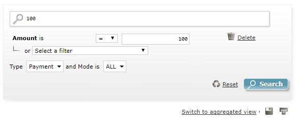 - Set filter = Amount and enter the desired amount in the available field. It is possible to search using the equal, bigger than or smaller than logic.