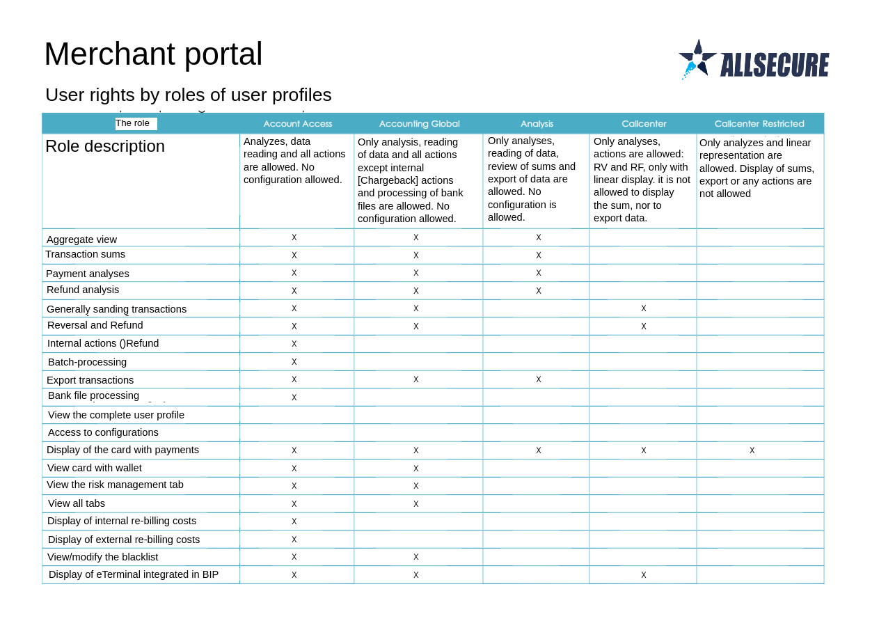 Da bi korisnik pristupio svom profilu na portalu trgovca, sem korisničkog imena i lozinke, njegov profil dobija i različita prava pristupa. Postoje nekoliko korisničkih uloga koje imaju posebna prava pristupa, a koja se dodeljuju svakom korisniku zasebno.